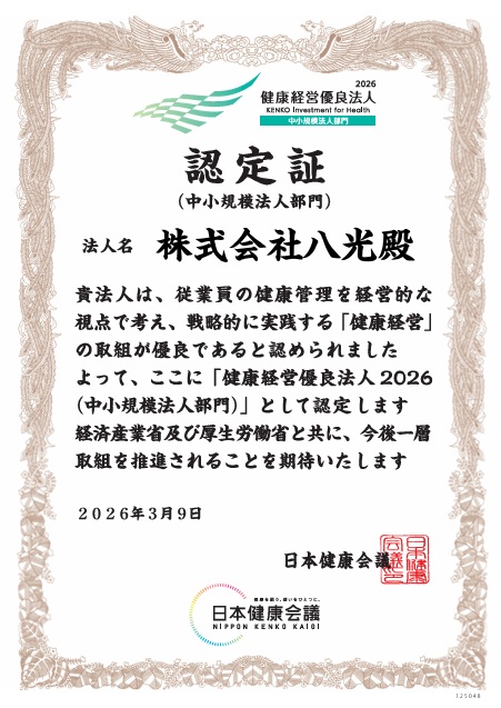 八光殿は健康経営優良法人2026(中小企業部門)に認定されました。