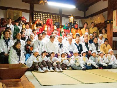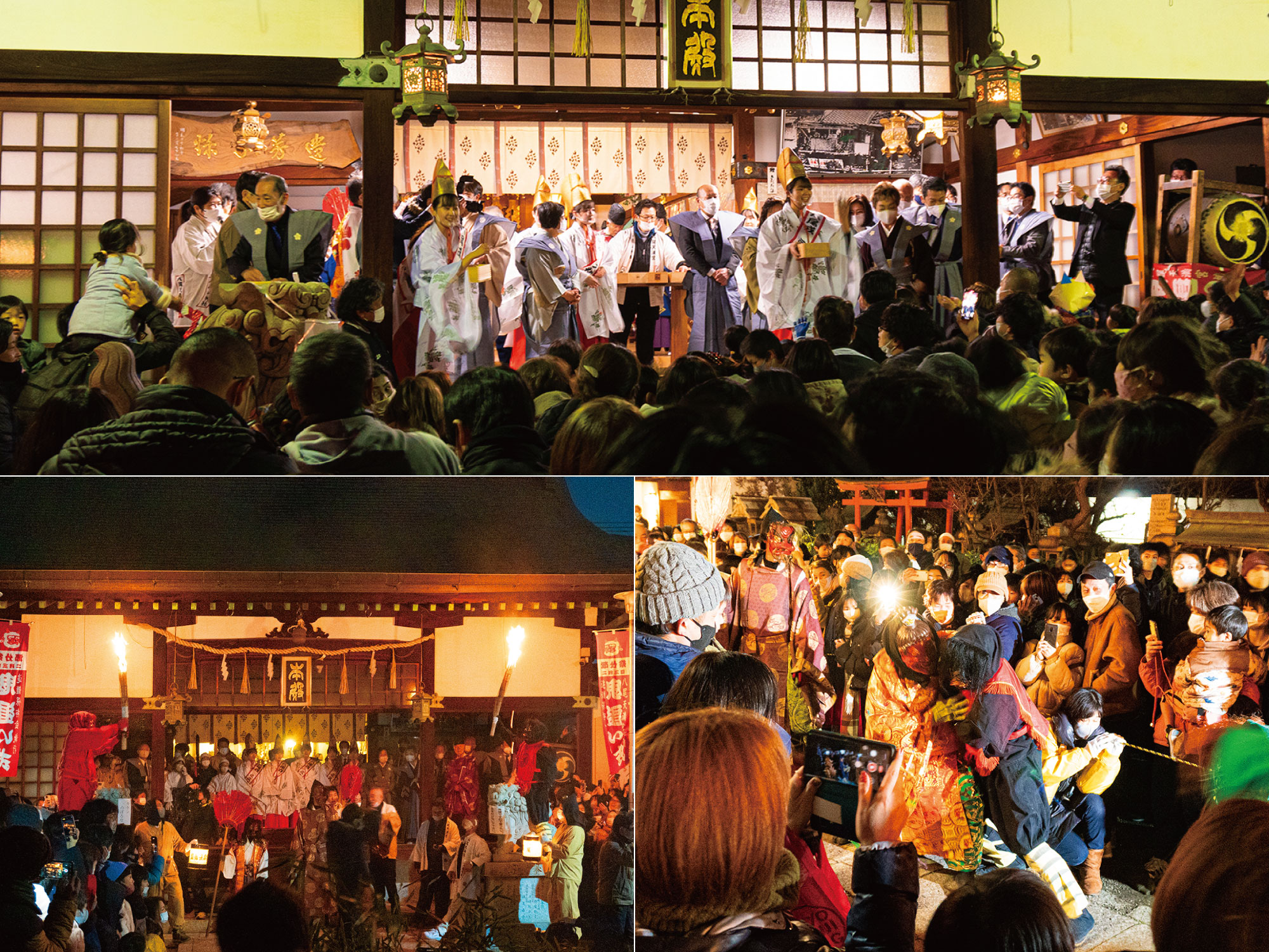 鬼追い式とは、松明を掲げ暴れながら拝殿に侵入しようとする「疫鬼(えっき)」「悪鬼(あっき)」を 「鬼追い神」が矛により追い払い、人々の無病息災、病魔退散を願う伝統行事です。