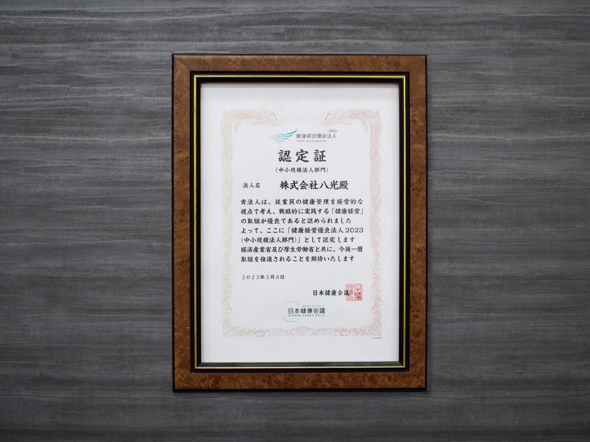 株式会社八光殿は、2023年3月8日付で、経済産業省・日本健康会議が進める「健康経営優良法人2023(中小企業部門)」に認定されました。