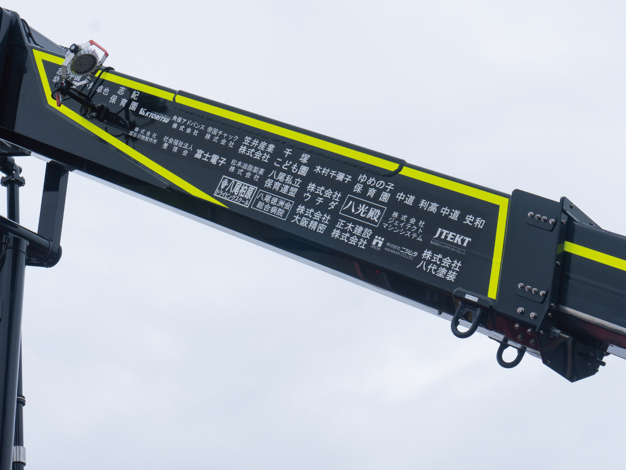 【八尾市消防本部】 消防力の強化応援プロジェクト ~市民の生命・身体・財産を守るために~へ寄附させていただき、屈折放水塔付多機能消防ポンプ自動車(消防車)のブーム(はしご部分)の側面にネームシールを貼り付けていただきました。