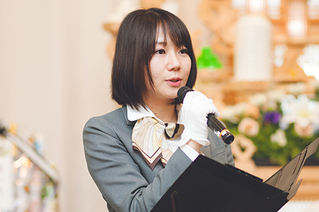 会館のメンテナンスからお葬式の準備・撤収、御葬儀の担当や司会進行業務を主に行っております。特に司会進行を任せていただくことが多く、ご親族様に合わせた打ち合わせやご説明、大勢の人前に立ってのご案内、宗教者様との打ち合わせ、マイクを握っての儀式進行、火葬場でのご案内やご葬儀後の手続きのご説明など、滞りなく故人様を弔う葬送儀礼を厳粛に執り行うサポート業務です。